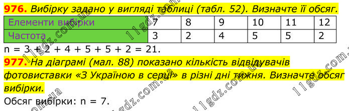 976. Вибірку задано у вигляді таблиці (табл. 52). Визначте її обсяг. Елементи вибірки 7 8 9 10 11 12 Частота 3 2 4 5 5 2 n = 3 + 2 + 4 + 5 + 5 + 2 = 21. 977. На діаграмі (мал. 88) показано кількість відвідувачів фотовиставки «З Україною в серці» в різні дні тижня. Визначте обсяг вибірки. Обсяг вибірки: n = 7.