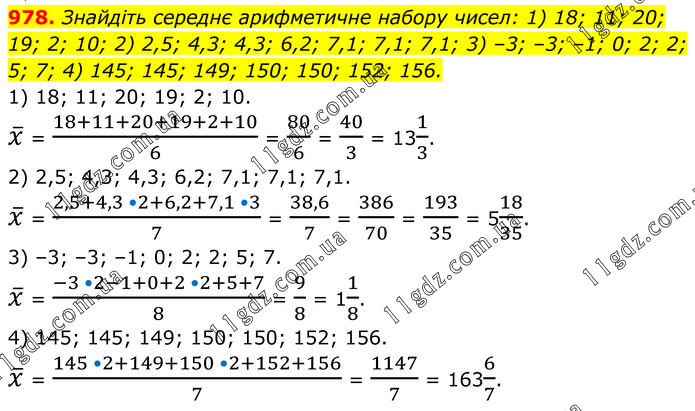 Знайдіть середнє арифметичне набору чисел: 1) 18; 11; 20; 19; 2; 10; 2) 2,5; 4,3; 4,3; 6,2; 7,1; 7,1; 7,1; 3) –3; –3; –1; 0; 2; 2; 5; 7; 4) 145; 145; 149; 150; 150; 152; 156. 1) 18; 11; 20; 19; 2; 10. x ̅ = (18+11+20+19+2+10)/6 = 80/6 = 40/3 = 131/3. 2) 2,5; 4,3; 4,3; 6,2; 7,1; 7,1; 7,1. x ̅ = (2,5+4,3 •2+6,2+7,1 •3)/7 = 38,6/7 = 386/70 = 193/35 = 518/35. 3) –3; –3; –1; 0; 2; 2; 5; 7. x ̅ = (-3 •2-1+0+2 •2+5+7)/8 = 9/8 = 11/8. 4) 145; 145; 149; 150; 150; 152; 156. x ̅ = (145 •2+149+150 •2+152+156)/7 = 1147/7 = 1636/7.