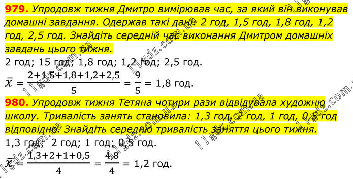979. Упродовж тижня Дмитро вимірював час, за який він виконував домашні завдання. Одержав такі дані: 2 год, 1,5 год, 1,8 год, 1,2 год, 2,5 год. Знайдіть середній час виконання Дмитром домашніх завдань цього тижня. 2 год; 15 год; 1,8 год; 1,2 год; 2,5 год. x ̅ = (2+1,5+1,8+1,2+2,5)/5 = 9/5 = 1,8 год. 980. Упродовж тижня Тетяна чотири рази відвідувала художню школу. Тривалість занять становила: 1,3 год, 2 год, 1 год, 0,5 год відповідно. Знайдіть середню тривалість заняття цього тижня. 1,3 год; 2 год; 1 год; 0,5 год. x ̅ = (1,3+2+1+0,5)/4 = 4,8/4 = 1,2 год.