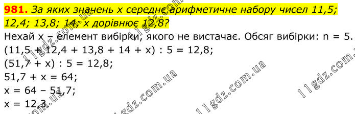 За яких значень х середнє арифметичне набору чисел 11,5; 12,4; 13,8; 14; х дорівнює 12,8? Нехай х – елемент вибірки, якого не вистачає. Обсяг вибірки: n = 5. (11,5 + 12,4 + 13,8 + 14 + x) : 5 = 12,8; (51,7 + x) : 5 = 12,8; 51,7 + x = 64; x = 64 – 51,7; x = 12,3.