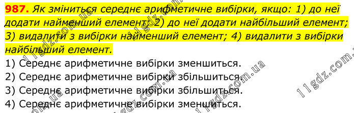 Як зміниться середнє арифметичне вибірки, якщо: 1) до неї додати найменший елемент; 2) до неї додати найбільший елемент; 3) видалити з вибірки найменший елемент; 4) видалити з вибірки найбільший елемент. 1) Середнє арифметичне вибірки зменшиться. 2) Середнє арифметичне вибірки збільшиться. 3) Середнє арифметичне вибірки збільшиться. 4) Середнє арифметичне вибірки зменшиться.