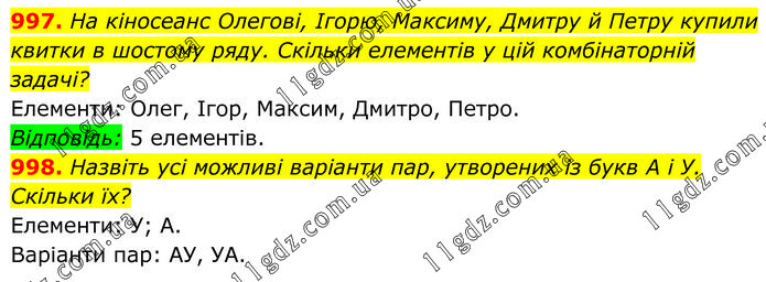 997. На кіносеанс Олегові, Ігорю, Максиму, Дмитру й Петру купили квитки в шостому ряду. Скільки елементів у цій комбінаторній задачі? Елементи: Олег, Ігор, Максим, Дмитро, Петро. Відповідь: 5 елементів. 998. Назвіть усі можливі варіанти пар, утворених із букв А і У. Скільки їх? Елементи: У; А. Варіанти пар: АУ, УА.