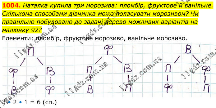 Наталка купила три морозива: пломбір, фруктове й ванільне. Скількома способами дівчинка може поласувати морозивом? Чи правильно побудовано до задачі дерево можливих варіантів на малюнку 92? Елементи: пломбір, фруктове морозиво, ванільне морозиво. 3 • 2 • 1 = 6 (сп.)