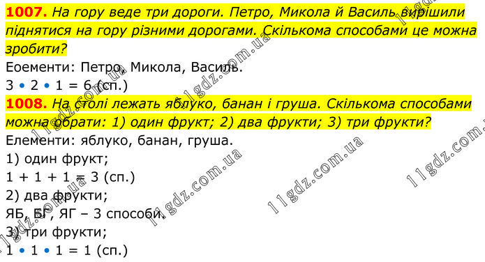1007. На гору веде три дороги. Петро, Микола й Василь вирішили піднятися на гору різними дорогами. Скількома способами це можна зробити? Еоементи: Петро, Микола, Василь. 3 • 2 • 1 = 6 (сп.) 1008. На столі лежать яблуко, банан і груша. Скількома способами можна обрати: 1) один фрукт; 2) два фрукти; 3) три фрукти? Елементи: яблуко, банан, груша. 1) один фрукт; 1 + 1 + 1 = 3 (сп.) 2) два фрукти; ЯБ, БГ, ЯГ – 3 способи. 3) три фрукти; 1 • 1 • 1 = 1 (сп.)