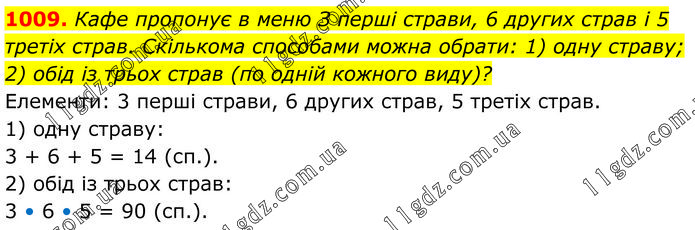 Кафе пропонує в меню З перші страви, 6 других страв і 5 третіх страв. Скількома способами можна обрати: 1) одну страву; 2) обід із трьох страв (по одній кожного виду)? Елементи: 3 перші страви, 6 других страв, 5 третіх страв. 1) одну страву: 3 + 6 + 5 = 14 (сп.). 2) обід із трьох страв: 3 • 6 • 5 = 90 (сп.).