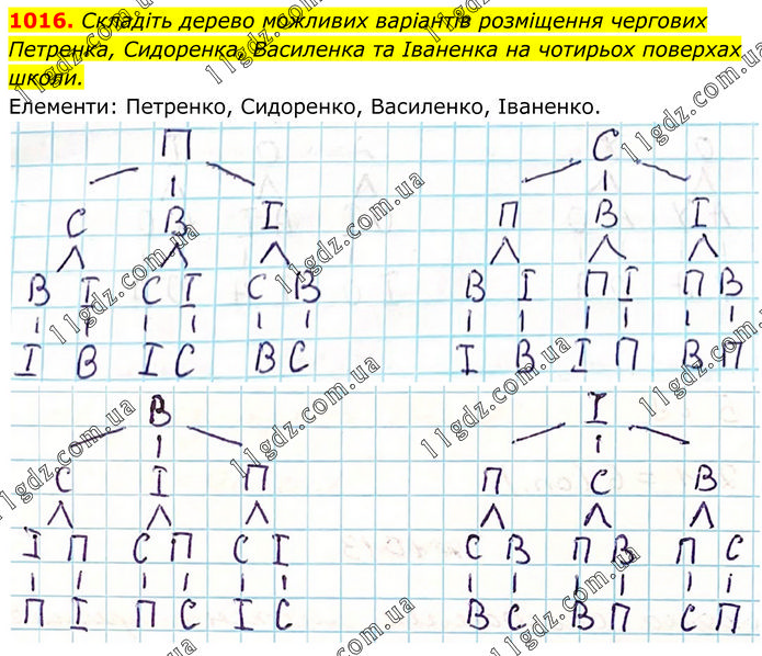 Складіть дерево можливих варіантів розміщення чергових Петренка, Сидоренка, Василенка та Іваненка на чотирьох поверхах школи. Елементи: Петренко, Сидоренко, Василенко, Іваненко.