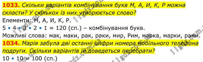 1033. Скільки варіантів комбінування букв М, А, И, К, P можна скласти? У скількох із них утворюється слово? Елементи: М, А, И, К, Р. 5 • 4 • 3 • 2 • 1 = 120 (сп.) – комбінування букв. Можливі слова: мак, маки, рак, раки, мир, Рим, марка, марки, рами. 1034. Марія забула дві останні цифри номера мобільного телефона подруги. Скільки варіантів їй доведеться перебрати? 10 • 10 = 100 (сп.)