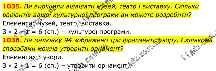 1035. Ви вирішили відвідати музей, театр і виставку. Скільки варіантів вашої культурної програми ви можете розробити? Елементи: музей, театр, виставка. 3 • 2 • 1 = 6 (сп.) – культурої програми. 1036. На малюнку 94 зображено три фрагменти узору. Скількома способами можна утворити орнамент? Елементи: 3 узори. 3 • 2 • 1 = 6 (сп.) – утворити орнамент.