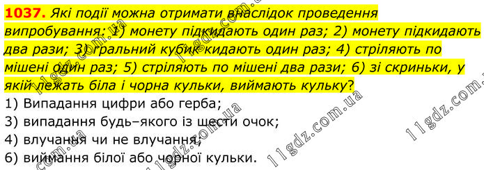 Які події можна отримати внаслідок проведення випробування: 1) монету підкидають один раз; 2) монету підкидають два рази; 3) гральний кубик кидають один раз; 4) стріляють по мішені один раз; 5) стріляють по мішені два рази; 6) зі скриньки, у якій лежать біла і чорна кульки, виймають кульку? 1) Випадання цифри або герба; 3) випадання будь–якого із шести очок; 4) влучання чи не влучання; 6) виймання білої або чорної кульки.