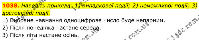 Наведіть приклад: 1) випадкової події; 2) неможливої події; 3) достовірної події. 1) Вибране навмання одноцифрове число буде непарним. 2) Після понеділка настане середа. 3) Після літа настане осінь.