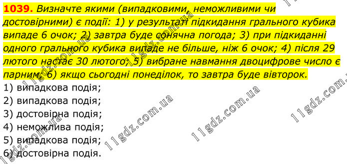 Визначте якими (випадковими, неможливими чи достовірними) є події: 1) у результаті підкидання грального кубика випаде 6 очок; 2) завтра буде сонячна погода; 3) при підкиданні одного грального кубика випаде не більше, ніж 6 очок; 4) після 29 лютого настає 30 лютого; 5) вибране навмання двоцифрове число є парним; 6) якщо сьогодні понеділок, то завтра буде вівторок. 1) випадкова подія; 2) випадкова подія; 3) достовірна подія; 4) неможлива подія; 5) випадкова подія; 6) достовірна подія.