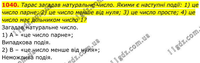 Тарас загадав натуральне число. Якими є наступні події: 1) це число парне; 2) це число менше від нуля; 3) це число просте; 4) це число має дільником число 1? Загадав натуральне число. 1) А – «це число парне»; Випадкова подія. 2) В – «це число менше від нуля»; Неможлива подія.