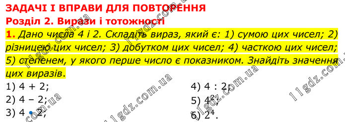 Дано числа 4 і 2. Складіть вираз, який є: 1) сумою цих чисел; 2) різницею цих чисел; 3) добутком цих чисел; 4) часткою цих чисел; 5) степенем, у якого перше число є показником. Знайдіть значення цих виразів. 1) 4 + 2; 2) 4 – 2; 3) 4 • 2; 4) 4 : 2; 5) 4^2; 6) 2^4.