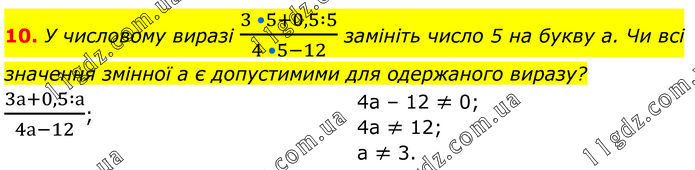 У числовому виразі (3 •5+0,5∶5)/(4 •5-12) замініть число 5 на букву а. Чи всі значення змінної а є допустимими для одержаного виразу? (3а+0,5∶а)/(4а-12); 4а – 12 ≠ 0; 4а ≠ 12; а ≠ 3.