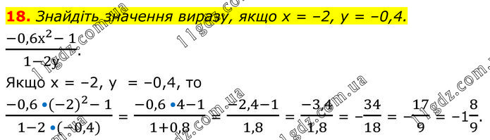 Знайдіть значення виразу, якщо х = –2, у = –0,4. (-0,6х^2- 1)/(1-2у). Якщо х = –2, у = –0,4, то (-0,6 •(-2)^2- 1)/(1-2 •(-0,4)) = (-0,6 •4-1)/(1+0,8) = (-2,4-1)/1,8 = (-3,4)/1,8 = –34/18 = –17/9 = –18/9.