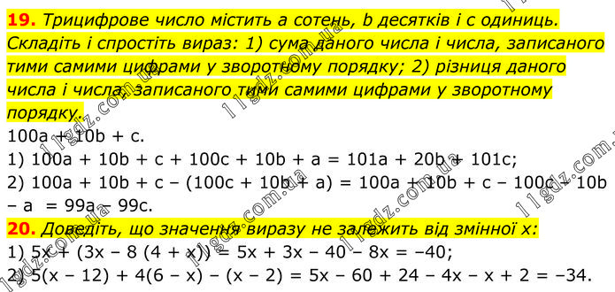 19. Трицифрове число містить а сотень, b десятків і с одиниць. Складіть і спростіть вираз: 1) сума даного числа і числа, записаного тими самими цифрами у зворотному порядку; 2) різниця даного числа і числа, записаного тими самими цифрами у зворотному порядку. 100a + 10b + c. 1) 100a + 10b + c + 100c + 10b + a = 101a + 20b + 101c; 2) 100a + 10b + c – (100c + 10b + a) = 100a + 10b + c – 100c – 10b – a = 99a – 99c. 20. Доведіть, що значення виразу не залежить від змінної х: 1) 5x + (3x – 8 (4 + x)) = 5x + 3x – 40 – 8x = –40; 2) 5(x – 12) + 4(6 – x) – (x – 2) = 5x – 60 + 24 – 4x – x + 2 = –34.