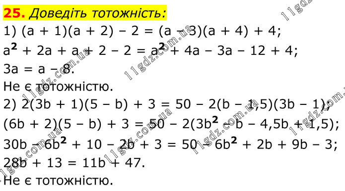 Доведіть тотожність: 1) (a + 1)(a + 2) – 2 = (a – 3)(a + 4) + 4; a2 + 2a + a + 2 – 2 = a2 + 4a – 3a – 12 + 4; 3a = a – 8. Не є тотожністю. 2) 2(3b + 1)(5 – b) + 3 = 50 – 2(b – 1,5)(3b – 1); (6b + 2)(5 – b) + 3 = 50 – 2(3b2 – b – 4,5b + 1,5); 30b – 6b2 + 10 – 2b + 3 = 50 – 6b2 + 2b + 9b – 3; 28b + 13 = 11b + 47. Не є тотожністю.
