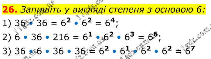Запишіть у вигляді степеня з основою 6: 1) 36 • 36 = 62 • 62 = 64; 2) 6 • 36 • 216 = 61 • 62 • 63 = 66; 3) 36 • 6 • 36 • 36 = 62 • 61 • 62 • 62 = 67.