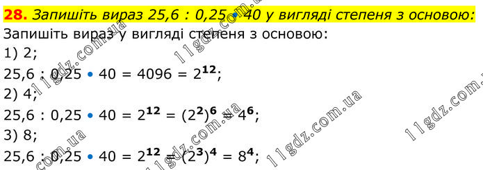 Запишіть вираз 25,6 : 0,25 • 40 у вигляді степеня з основою: Запишіть вираз у вигляді степеня з основою: 1) 2; 25,6 : 0,25 • 40 = 4096 = 212; 2) 4; 25,6 : 0,25 • 40 = 212 = (22)6 = 46; 3) 8; 25,6 : 0,25 • 40 = 212 = (23)4 = 84;