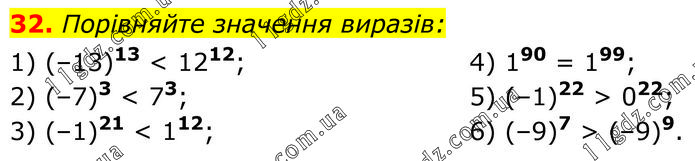 Порівняйте значення виразів: 1) (–13)13 < 1212; 2) (–7)3 < 73; 3) (–1)21 < 112; 4) 190 = 199; 5) (–1)22 > 022; 6) (–9)7 > (–9)9.