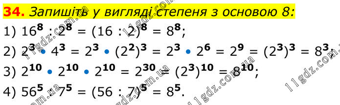 Запишіть у вигляді степеня з основою 8: 1) 168 : 28 = (16 : 2)8 = 88; 2) 23 • 43 = 23 • (22)3 = 23 • 26 = 29 = (23)3 = 83; 3) 210 • 210 • 210 = 230 = (23)10 = 810; 4) 565 : 75 = (56 : 7)5 = 85.