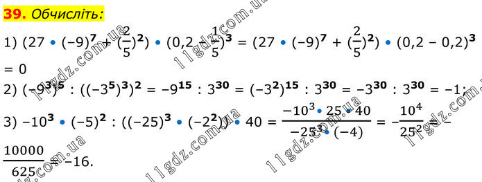 Обчисліть: 1) (27 • (–9)7 + (2/5)2) • (0,2 – 1/5)3 = (27 • (–9)7 + (2/5)2) • (0,2 – 0,2)3 = 0 2) (–93)5 : ((–35)3)2 = –915 : 330 = (–32)15 : 330 = –330 : 330 = –1; 3) –103 • (–5)2 : ((–25)3 • (–22)) • 40 = (〖-10〗^3• 25 • 40)/(〖-25〗^3• (-4)) = –10^4/25^2 = –10000/625 = –16.