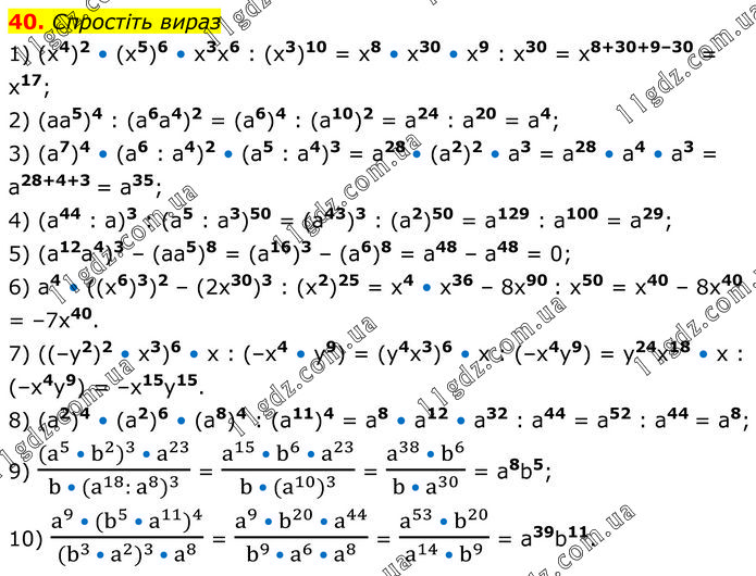 Спростіть вираз 1) (x4)2 • (x5)6 • x3x6 : (x3)10 = x8 • x30 • x9 : x30 = x8+30+9–30 = x17; 2) (aa5)4 : (a6a4)2 = (a6)4 : (a10)2 = a24 : a20 = a4; 3) (a7)4 • (a6 : a4)2 • (a5 : a4)3 = a28 • (a2)2 • a3 = a28 • a4 • a3 = a28+4+3 = a35; 4) (a44 : a)3 : (a5 : a3)50 = (a43)3 : (a2)50 = a129 : a100 = a29; 5) (a12a4)3 – (aa5)8 = (a16)3 – (a6)8 = a48 – a48 = 0; 6) a4 • ((x6)3)2 – (2x30)3 : (x2)25 = x4 • x36 – 8x90 : x50 = x40 – 8x40 = –7x40. 7) ((–y2)2 • x3)6 • x : (–x4 • y9) = (y4x3)6 • x : (–x4y9) = y24x18 • x : (–x4y9) = –x15y15. 8) (a2)4 • (a2)6 • (a8)4 : (a11)4 = a8 • a12 • a32 : a44 = a52 : a44 = a8; 9) ((a^5 • b^2 )^3 • a^23)/(b • (a^18: a^8 )^3 ) = (a^15 • b^6 • a^23)/(b • (a^10 )^3 ) = (a^38 •〖 b〗^6)/(b • a^30 ) = a8b5; 10) (a^9 • (b^5 • a^11 )^4)/((b^(3 )• a^2 )^(3 )• a^8 ) = (a^9 • b^20 • a^44)/(b^(9 )• a^6 • a^8 ) = (a^53 • b^20)/(a^14 • b^9 ) = a39b11.