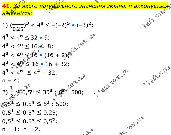 За якого натурального значення змінної п виконується нерівність: 1) (1/0,25)3 < 4n ≤ –(–2)5 • (–3)2; 43 < 4n ≤ 32 • 9; 43 < 4n ≤ 16 • 18; 43 < 4n ≤ 16 • (16 + 2); 43 < 4n ≤ 16 • 16 + 32; 43 < 4n ≤ 44 + 32; n = 4; 2) 1/2 ≤ 0,5n ≤ 303 : 63 : 500; 0,51 ≤ 0,5n ≤ 53 : 500; 0,51 ≤ 0,5n ≤ 0,25; 0,51 ≤ 0,5n ≤ 0,52; n = 1; n = 2.