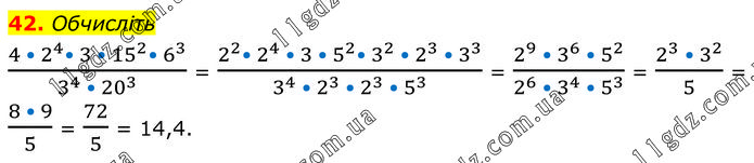 Обчисліть (4 • 2^4• 3 • 15^2• 6^3)/(3^4 • 20^3 ) = (2^2• 2^4 • 3 • 5^2• 3^2 • 2^3 • 3^3)/(3^4 •〖 2〗^3 • 2^3 • 5^3 ) = (2^9 • 3^6 • 5^2)/(2^6 • 3^4 • 5^3 ) = (2^3 • 3^2)/5 = (8 • 9)/5 = 72/5 = 14,4.