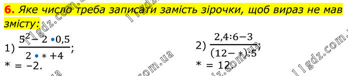 Яке число треба записати замість зірочки, щоб вираз не мав змісту: 1) (5^2- 2 •0,5)/(2 • * +4); * = –2. 2) (2,4∶6-3)/((12- *):5); * = 12.