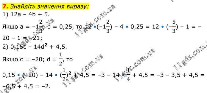 Знайдіть значення виразу: 1) 12a – 4b + 5. Якщо а = –12/3; b = 0,25, то 12 •(–12/3) – 4 • 0,25 = 12 • (–5/3) – 1 = –20 – 1 = –21; 2) 0,15c – 14d2 + 4,5. Якщо с = –20; d = 1/2, то 0,15 • (–20) – 14 • (1/2)2 + 4,5 = –3 – 14 • 1/4 + 4,5 = –3 – 3,5 + 4,5 = –6,5 + 4,5 = –2.