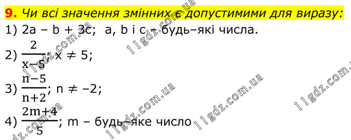 Чи всі значення змінних є допустимими для виразу: 1) 2a – b + 3c; a, b i c – будь–які числа. 2) 2/(x-5); x ≠ 5; 3) (n-5)/(n+2); n ≠ –2; 4) (2m+4)/5; m – будь–яке число.