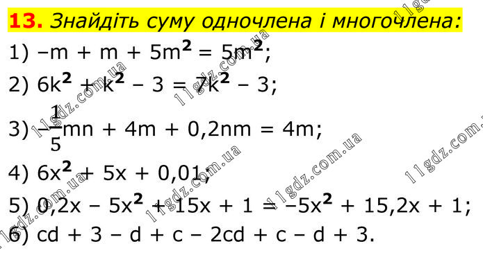 Знайдіть суму одночлена і многочлена: 1) –m + m + 5m2 = 5m2; 2) 6k2 + k2 – 3 = 7k2 – 3; 3) –1/5mn + 4m + 0,2nm = 4m; 4) 6x2 + 5x + 0,01; 5) 0,2x – 5x2 + 15x + 1 = –5x2 + 15,2x + 1; 6) cd + 3 – d + c – 2cd + c – d + 3.
