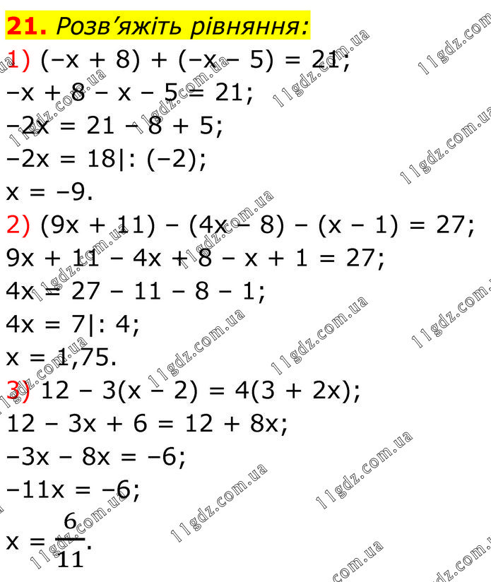 Розв’яжіть рівняння: 1) (–x + 8) + (–x – 5) = 21; –x + 8 – x – 5 = 21; –2x = 21 – 8 + 5; –2x = 18|: (–2); x = –9. 2) (9x + 11) – (4x – 8) – (x – 1) = 27; 9x + 11 – 4x + 8 – x + 1 = 27; 4x = 27 – 11 – 8 – 1; 4x = 7|: 4; x = 1,75. 3) 12 – 3(x – 2) = 4(3 + 2x); 12 – 3x + 6 = 12 + 8x; –3x – 8x = –6; –11x = –6; x = 6/11.