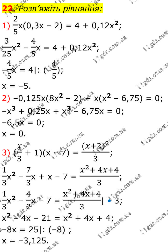 Розв’яжіть рівняння: 1) 2/5x(0,3x – 2) = 4 + 0,12x2; 3/25x2 – 4/5x = 4 + 0,12x2; –4/5x = 4|: (–4/5); x = –5. 2) –0,125x(8x2 – 2) + x(x2 – 6,75) = 0; –x3 + 0,25x + x3 – 6,75x = 0; –6,5x = 0; x = 0. 3) (x/3 + 1)(x – 7) = ((x+2)^2)/3; 1/3x2 – 7/3x + x – 7 = (x^2+ 4x+4)/3; 1/3x2 – 4/2x – 7 = (x^2+ 4x+4)/3| • 3; x2 – 4x – 21 = x2 + 4x + 4; –8x = 25|: (–8) ; x = –3,125.