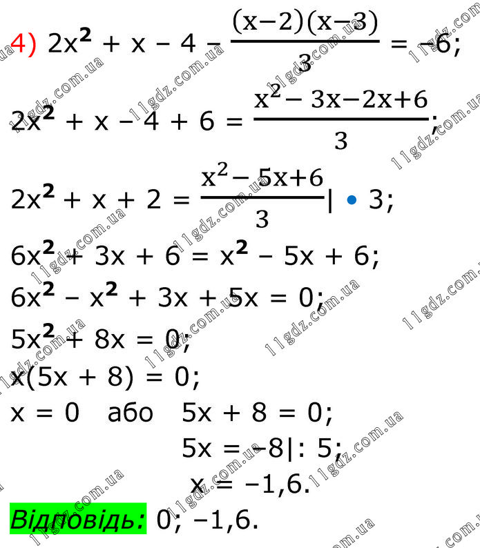 2x2 + x – 4 – ((x-2)(x-3))/3 = –6; 2x2 + x – 4 + 6 = (x^2- 3x-2x+6)/3; 2x2 + x + 2 = (x^2- 5x+6)/3| • 3; 6x2 + 3x + 6 = x2 – 5x + 6; 6x2 – x2 + 3x + 5x = 0; 5x2 + 8x = 0; x(5x + 8) = 0; x = 0 або 5x + 8 = 0; 5x = –8|: 5; x = –1,6. Відповідь: 0; –1,6.