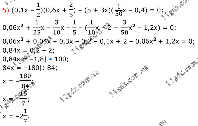 (0,1x – 1/2)(0,6x + 2/5) – (5 + 3x)( 1/50x – 0,4) = 0; 0,06x2 + 1/25x – 3/10x – 1/5 – (1/10x – 2 + 3/50x2 – 1,2x) = 0; 0,06x2 + 0,04x – 0,3x – 0,2 – 0,1x + 2 – 0,06x2 + 1,2x = 0; 0,84x = 0,2 – 2; 0,84x = –1,8| • 100; 84x = –180|: 84; x = –180/84; x = –15/7; x = –21/7.