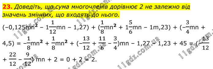 Доведіть, що сума многочленів дорівнює 2 не залежно від значень змінних, що входять до нього. (–0,125mn2 – 11/12mn – 1,27) + (1/8mn2 + 15/6mn – 1m,23) + (–3/4mn + 4,5) = –1/8mn2 + 1/8mn2 + (–13/12 + 11/6 – 3/4)mn – 1,27 – 1,23 + 45 = (–13/12 + 22/12 – 9/12) mn + 2 = 0 + 2 = 2.