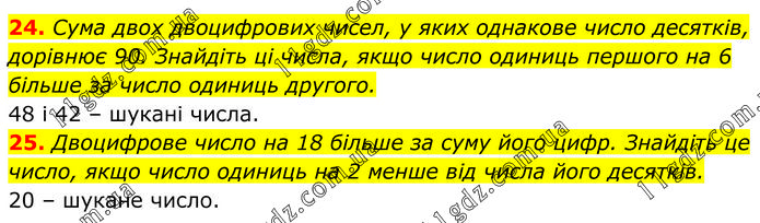 24. Сума двох двоцифрових чисел, у яких однакове число десятків, дорівнює 90. Знайдіть ці числа, якщо число одиниць першого на 6 більше за число одиниць другого. 48 і 42 – шукані числа. 25. Двоцифрове число на 18 більше за суму його цифр. Знайдіть це число, якщо число одиниць на 2 менше від числа його десятків. 20 – шукане число.