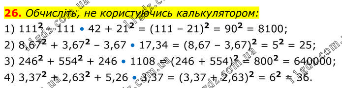 Обчисліть, не користуючись калькулятором: 1) 1112 – 111 • 42 + 212 = (111 – 21)2 = 902 = 8100; 2) 8,672 + 3,672 – 3,67 • 17,34 = (8,67 – 3,67)2 = 52 = 25; 3) 2462 + 5542 + 246 • 1108 = (246 + 554)2 = 8002 = 640000; 4) 3,372 + 2,632 + 5,26 • 3,37 = (3,37 + 2,63)2 = 62 = 36.