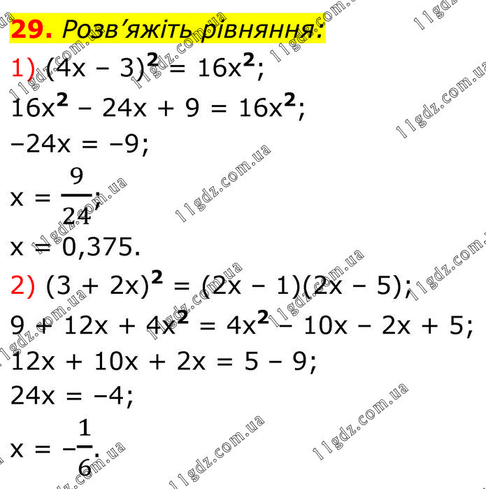 Розв’яжіть рівняння: 1) (4x – 3)2 = 16x2; 16x2 – 24x + 9 = 16x2; –24x = –9; x = 9/24; x = 0,375. 2) (3 + 2x)2 = (2x – 1)(2x – 5); 9 + 12x + 4x2 = 4x2 – 10x – 2x + 5; 12x + 10x + 2x = 5 – 9; 24x = –4; x = –1/6.