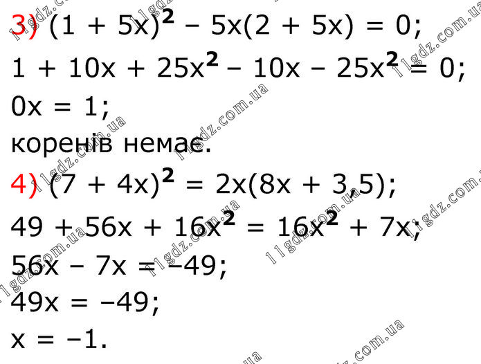 3) (1 + 5x)2 – 5x(2 + 5x) = 0; 1 + 10x + 25x2 – 10x – 25x2 = 0; 0x = 1; коренів немає. 4) (7 + 4x)2 = 2x(8x + 3,5); 49 + 56x + 16x2 = 16x2 + 7x; 56x – 7x = –49; 49x = –49; x = –1.