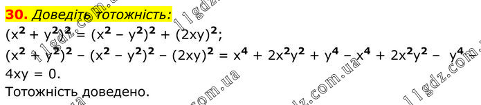 Доведіть тотожність: (x2 + y2)2 = (x2 – y2)2 + (2xy)2; (x2 + y2)2 – (x2 – y2)2 – (2xy)2 = x4 + 2x2y2 + y4 – x4 + 2x2y2 – y4 – 4xy = 0. Тотожність доведено.