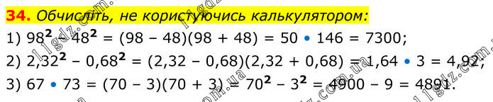 Обчисліть, не користуючись калькулятором: 1) 982 – 482 = (98 – 48)(98 + 48) = 50 • 146 = 7300; 2) 2,322 – 0,682 = (2,32 – 0,68)(2,32 + 0,68) = 1,64 • 3 = 4,92; 3) 67 • 73 = (70 – 3)(70 + 3) = 702 – 32 = 4900 – 9 = 4891.