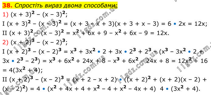 Спростіть вираз двома способами: 1) (x + 3)2 – (x – 3)2; I (x + 3)2 – (x – 3)2 = (x + 3 – x + 3)(x + 3 + x – 3) = 6 • 2x = 12x; II (x + 3)2 – (x – 3)2 = x2 + 6x + 9 – x2 + 6x – 9 = 12x. 2) (x + 2)3 – (x – 2)3; I (x + 2)3 – (x – 2)3 = x3 + 3x2 • 2 + 3x • 23 + 23 – (x3 – 3x2 • 2 + 3x • 23 – 23) = x3 + 6x2 + 24x + 8 – x3 + 6x2 – 24x + 8 = 12x2 + 16 = 4(3x2 + 4); II (x + 2)3 – (x – 2)3 = (x + 2 – x + 2) • ((x + 2)2 + (x + 2)(x – 2) + (x – 2)2) = 4 • (x2 + 4x + 4 + x2 – 4 + x2 – 4x + 4) 4 • (3x2 + 4).