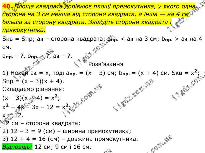 Площа квадрата дорівнює площі прямокутника, у якого одна сторона на 3 см менша від сторони квадрата, а інша — на 4 см більша за сторону квадрата. Знайдіть сторони квадрата і прямокутника. Sкв = Sпр; a4 – сторона квадрата; апр. < a4 на 3 см; bпр. > a4 на 4 см. апр. – ?, bпр. – ?, а4 – ?. Розв’язання 1) Нехай а4 = х, тоді апр. = (х – 3) см; bпр. = (х + 4) см. Sкв = х2; Sпр = (х – 3)(х + 4). Складаємо рівняння: (x – 3)(x + 4) = x2; x2 + 4x – 3x – 12 = x2; x = 12. 12 см – сторона квадрата; 2) 12 – 3 = 9 (см) – ширина прямокутника; 3) 12 + 4 = 16 (см) – довжина прямокутника. Відповідь: 12 см; 9 см і 16 см.