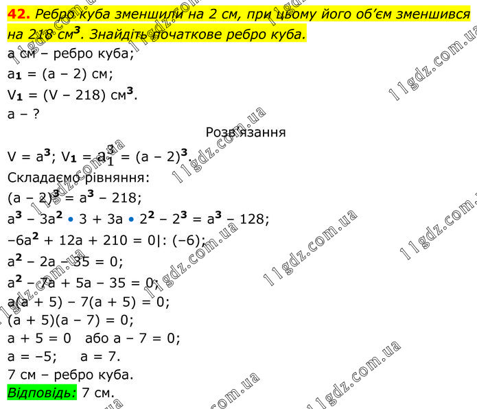 Ребро куба зменшили на 2 см, при цьому його об’єм зменшився на 218 см3. Знайдіть початкове ребро куба. а см – ребро куба; а1 = (а – 2) см; V1 = (V – 218) cм3. а – ? Розв’язання V = a3; V1 = a_1^3 = (a – 2)3. Складаємо рівняння: (а – 2)3 = а3 – 218; а3 – 3а2 • 3 + 3а • 22 – 23 = а3 – 128; –6а2 + 12а + 210 = 0|: (–6); a2 – 2a – 35 = 0; a2 – 7a + 5a – 35 = 0; a(a + 5) – 7(a + 5) = 0; (a + 5)(a – 7) = 0; a + 5 = 0 або а – 7 = 0; а = –5; а = 7. 7 см – ребро куба. Відповідь: 7 см.