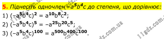 Піднесіть одночлен –а5b4с до степеня, що дорівнює: 1) (–a5b4c)2 = a10b8c2; 2) (–a5b4c)5 = –a25b20c5; 3) (–a5b4c)100 = a500b400c100.