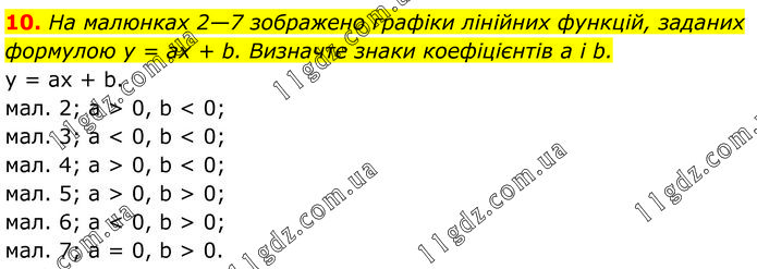На малюнках 2—7 зображено графіки лінійних функцій, заданих формулою у = ах + b. Визначте знаки коефіцієнтів а і b. y = ax + b. мал. 2; a > 0, b < 0; мал. 3; a < 0, b < 0; мал. 4; a > 0, b < 0; мал. 5; a > 0, b > 0; мал. 6; a < 0, b > 0; мал. 7; a = 0, b > 0.
