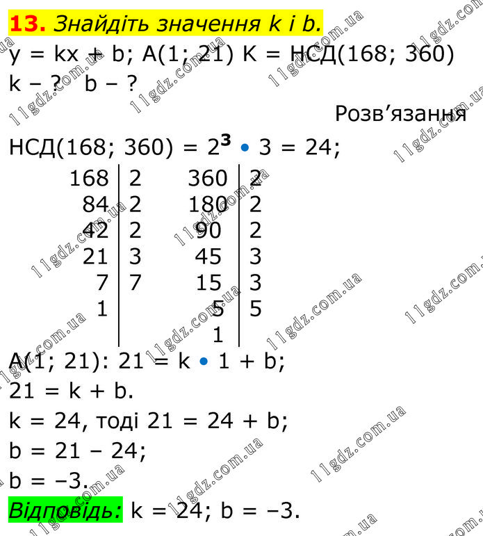 Знайдіть значення k і b. y = kx + b; A(1; 21) K = НСД(168; 360) k – ? b – ? Розв’язання НСД(168; 360) = 23 • 3 = 24; A(1; 21): 21 = k • 1 + b; 21 = k + b. k = 24, тоді 21 = 24 + b; b = 21 – 24; b = –3. Відповідь: k = 24; b = –3.